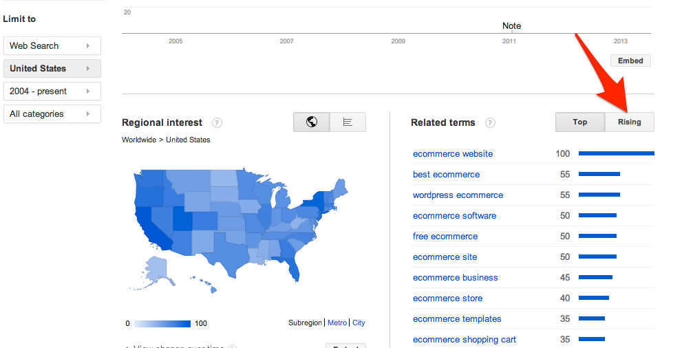 - Google Trends is a great place to find the keywords and topics people are presently using to search for product information . Enter a keyword or product like “skis” into the search box then click on “Rising”