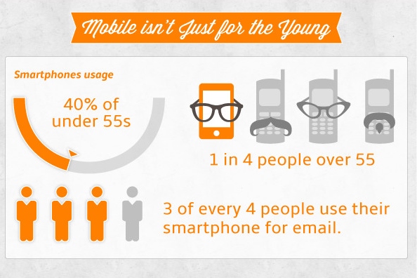 Throw out any preconceived notions you may have about who uses smartphones. While more than 40% of all age groups under 55 are smartphone users, a quarter of those aged 55 and older also own smartphones. Not only that, 75% of people in the United States use their smartphones to access and read email.Top portion (2)