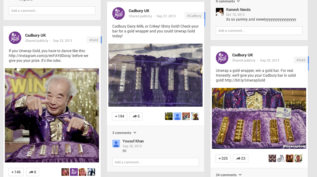 Their feed is also well-integrated into their wider marketing campaigns. Throughout their recent “Unwrap Gold” campaign—a Charlie and the Chocolate Factory style campaign that rewarded lucky customers who found gold-wrapped chocolate bars with an actual gold bar worth £22,000—the company used their G+ boards to generate excitement with linked videos and images.