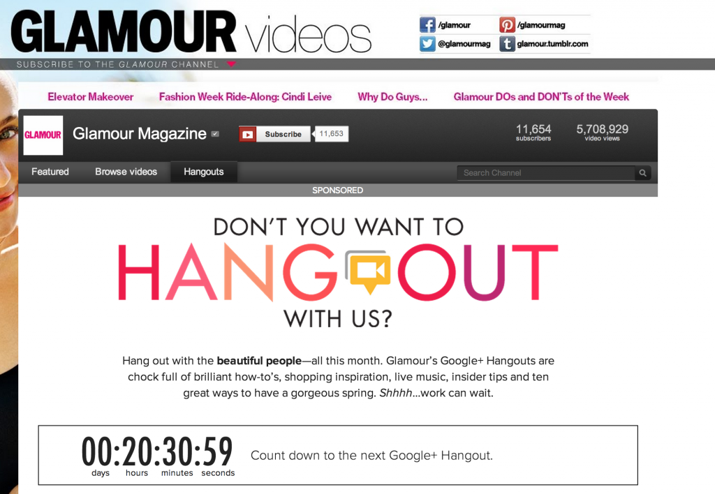 As you can probably imagine, there are myriad ways to take advantage of this tool. Earlier this year,Glamour did an entire Hangout campaign, featuring staffers and celebs. Each Hangout was sponsored by a brand, creating ample opportunities for product placement while still providing interesting and relevant content to followers. In doing Hangouts in an intense campaign style, the magazine could build momentum as they went, with each Hangout generating more excitement about the next.